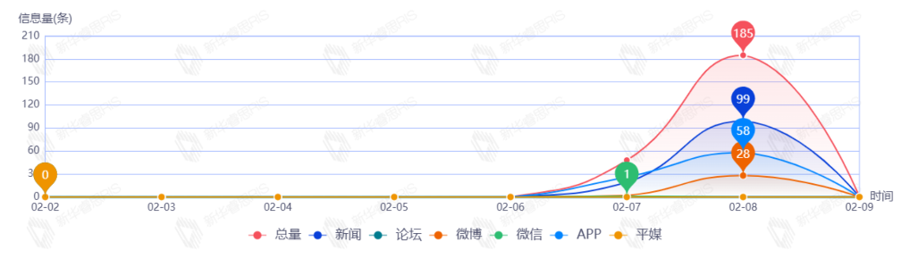 截至目前,该文章在互联网上传播总量233篇。其中2月8日是传播的高峰期,共传播185篇文章。各信源的信息发布情况中,新闻信息占比最大,其次是app和微博,占比分别为50.86%、36.21%、12.50%。(数据来源:新华睿思数据云图分析平台)