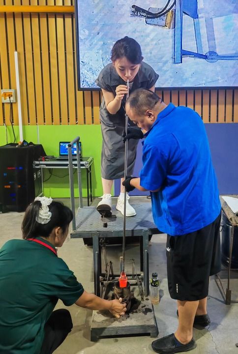 在工人师傅的协助下,19岁女大学生任禹汐体验了人工吹制玻璃器皿的制作过程。她一只脚踩住模具机的踏板,一边往吹管里吹气,模具里融化的玻璃就慢慢被吹成了饮料杯雏形。