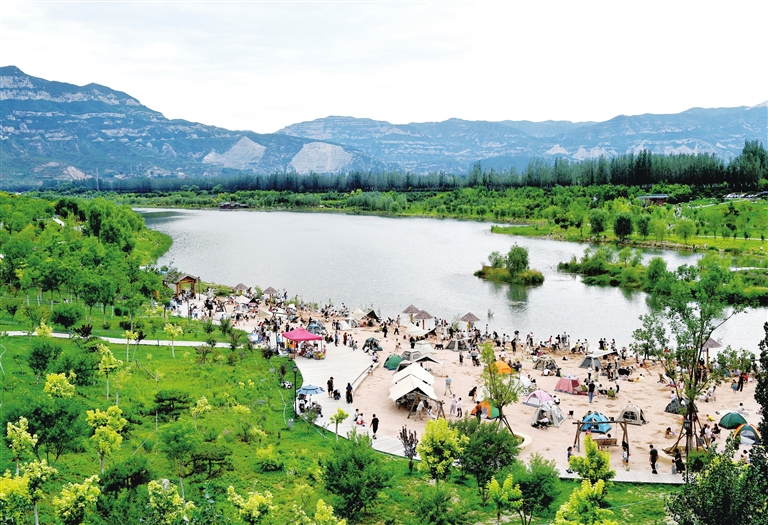 7月6日,汾河景区四期内,人称“太原小三亚”的沙滩区域迎来众多游客露营游玩。牛利敏 摄