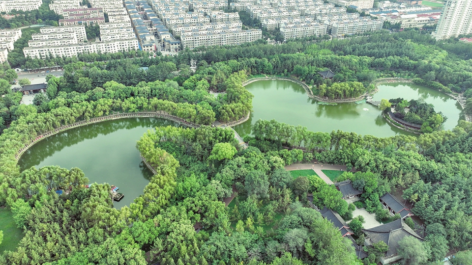 7月10日,永济市柳园内湖水如玉,绿树成荫,构成一幅美丽的夏日画卷。(程永仁摄)
