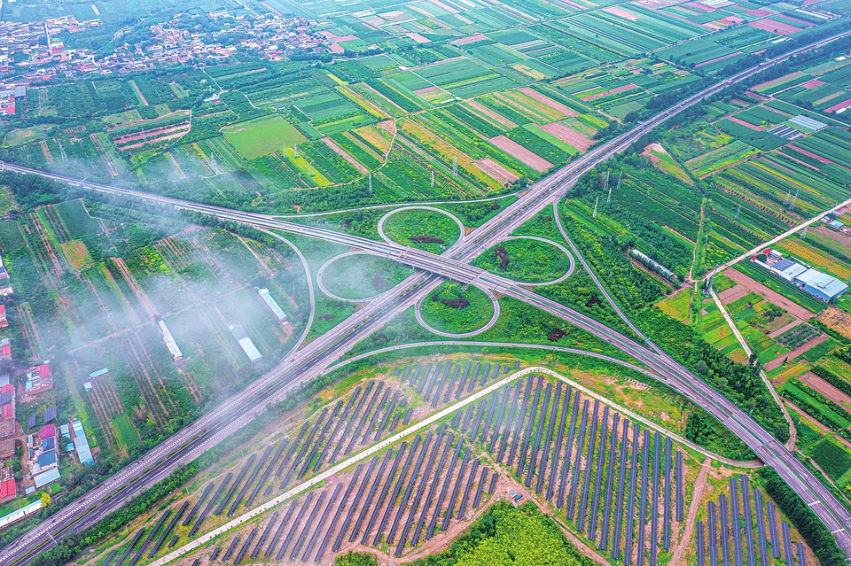 8月5日,俯瞰运城市侯平高速公路东郭枢纽互通区,纵横交错、四通八达,与周边农田、村庄等相映成景,方便人们出行,带动当地经济实现快速发展。(杨建峰摄)