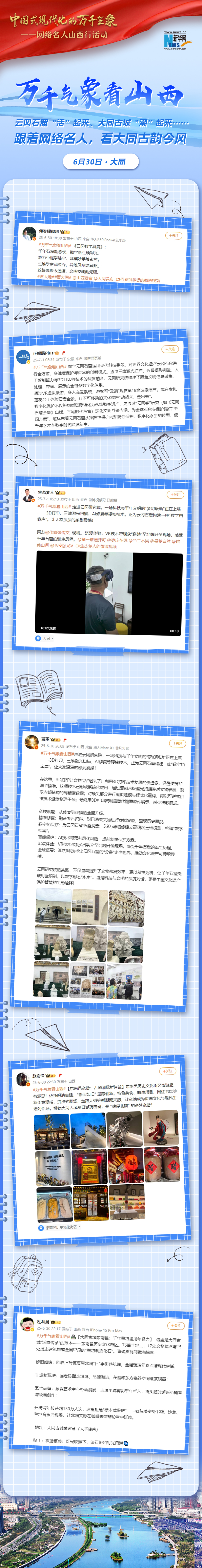 6月30日,“中国式现代化的万千气象”网络名人山西行活动在山西大同拉开帷幕。活动首日,来自全国各地的25名网络名人齐聚大同,感受大同在文化传承与创新发展中展现出的新成果、新气象。