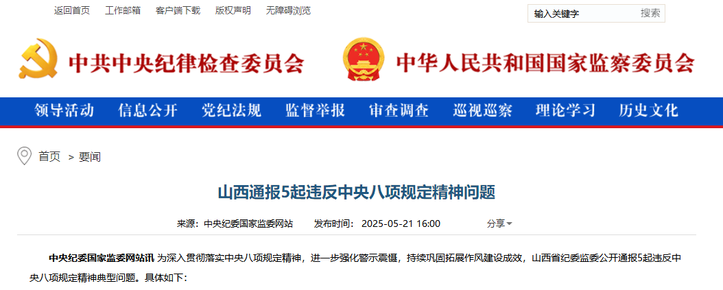 原标题:山西通报5起违反中央八项规定精神问题