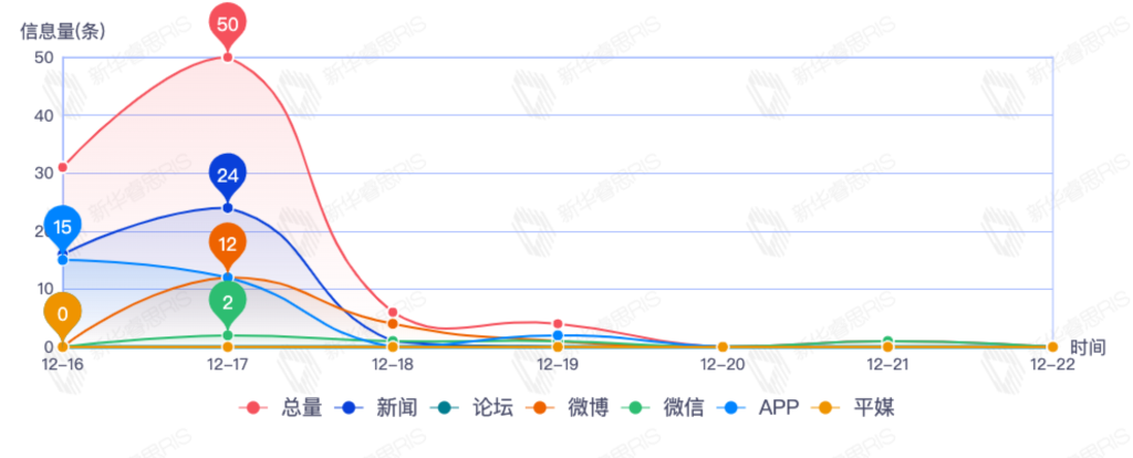 截至目前,该文章在互联网上传播总量92篇。其中12月17日是传播的高峰期,共传播50篇文章。各信源的信息发布情况中,新闻信息占比最大,其次是微博和app,信息量分别为41、17、17,占比分别为51.25%、21.25%、21.25%。(数据来源:新华睿思数据云图分析平台)