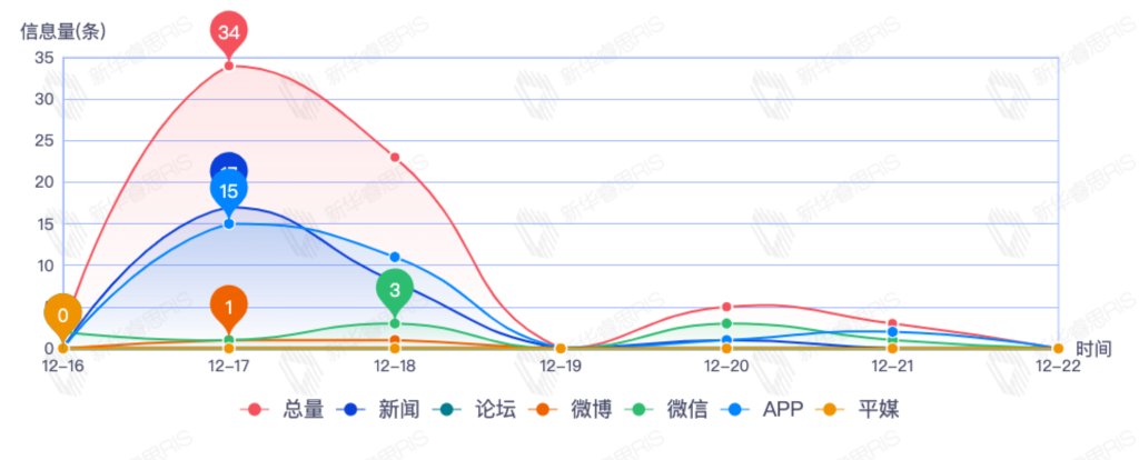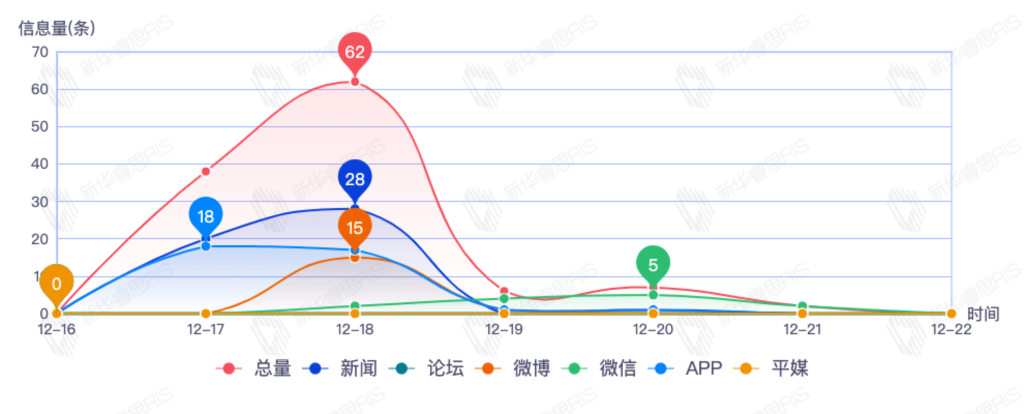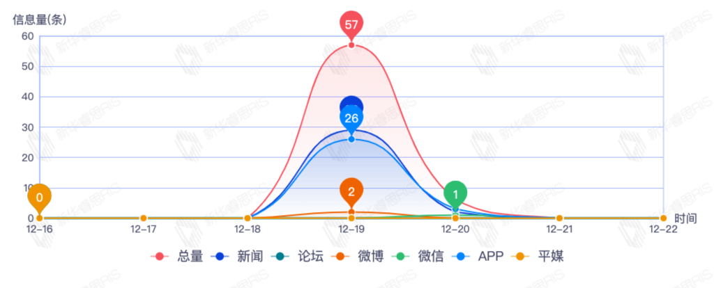 截至目前,该文章在互联网上传播总量492篇。其中12月21日是传播的高峰期,共传播362篇文章。各信源的信息发布情况中,新闻信息占比最大,其次是app和微信,信息量分别为181、177、73,占比分别为39.09%、38.23%、15.77%。(数据来源:新华睿思数据云图分析平台)