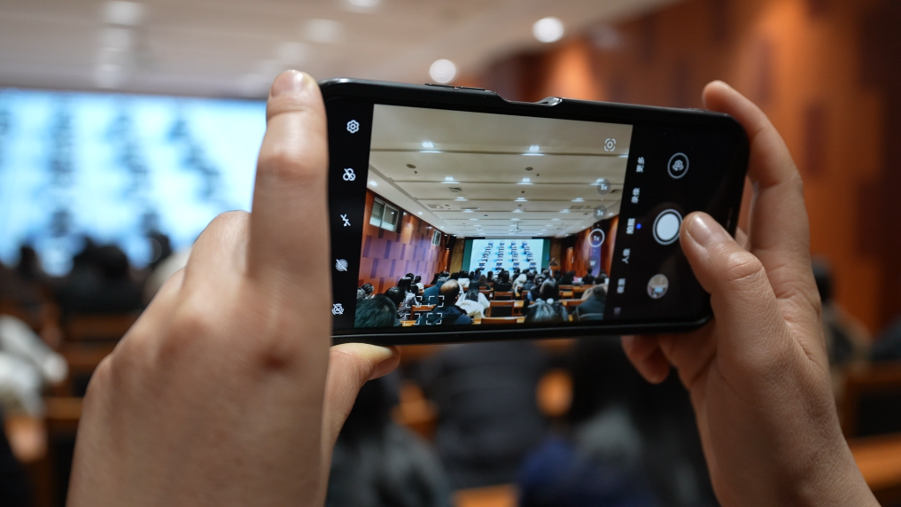 12月30日,在“影像里的大思政·九三阅兵展”全国高校巡展山西医科大学站开幕仪式现场,与会人员用手机进行记录。 新华网发