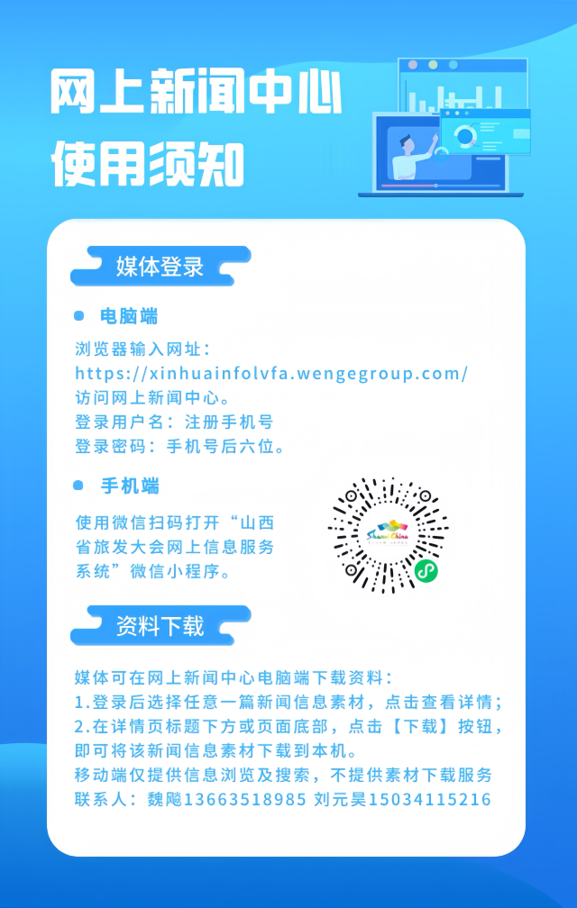 2024年山西省旅游发展大会还开设网上新闻中心和微信小程序,为参会媒体及时提供文字、图片、视频等专业的新闻素材服务,注册媒体记者可通过输入账号(手机号)进入网上新闻信息服务(info)系统,浏览并免费下载使用系统内所有文字、视频、图片等新闻素材。