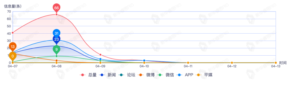 截至目前,该文章在互联网上传播总量82篇。其中4月8日是传播的高峰期,共传播66篇文章。各信源的信息发布情况中,app信息占比最大,其次是新闻和微博,信息量分别为33、31、11,占比分别为40.24%、37.80%、13.41%。(数据来源:新华睿思数据云图分析平台)