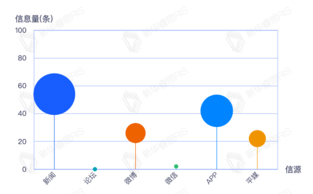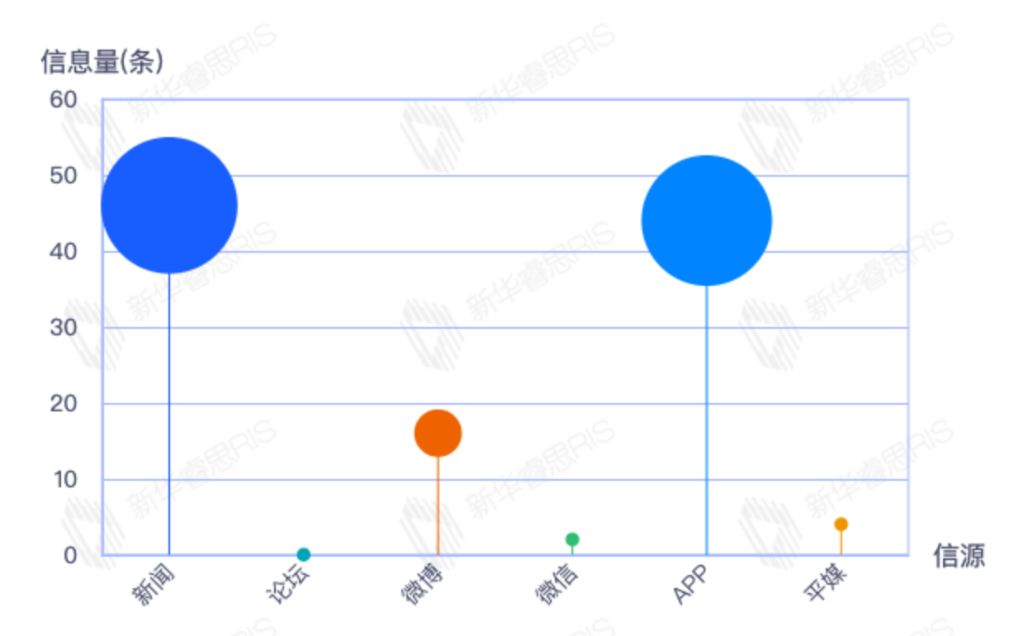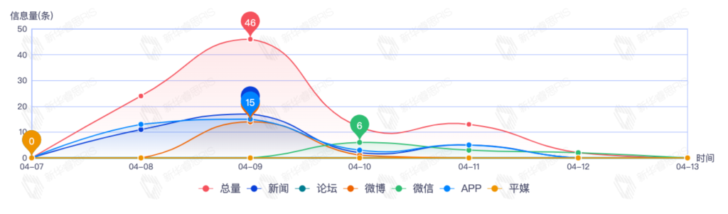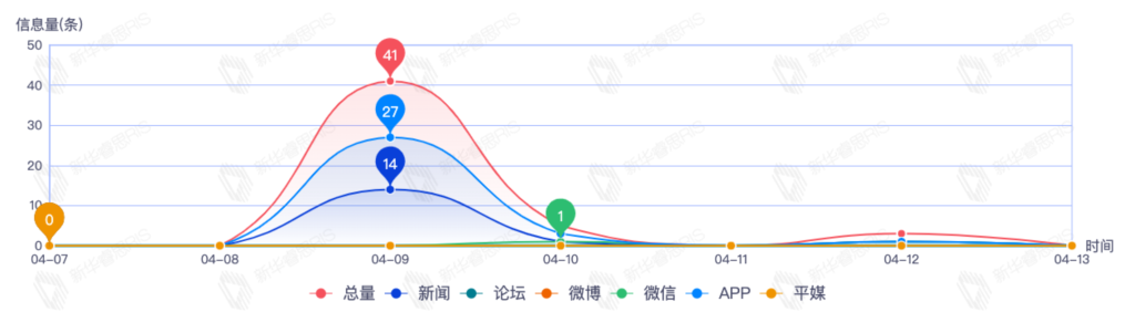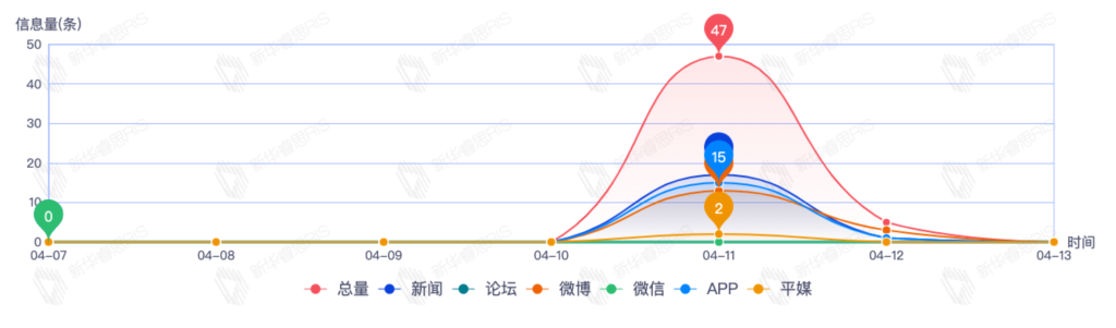 截至目前,该文章在互联网上传播总量54篇。其中4月11日是传播的高峰期,共传播45篇文章。各信源的信息发布情况中,新闻信息占比最大,其次是app和平媒,信息量分别为25、23、2,占比分别为46.30%、42.59%、3.70%。(数据来源:新华睿思数据云图分析平台)