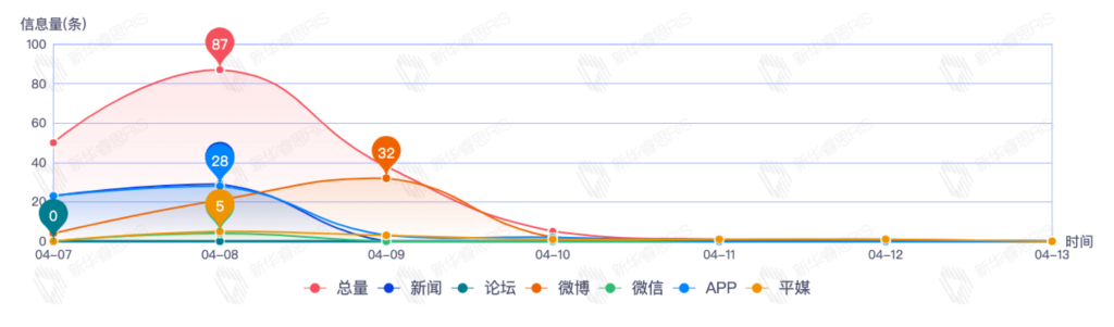 截至目前,该文章在互联网上传播总量182篇。其中4月8日是传播的高峰期,共传87篇文章。各信源的信息发布情况中,微博信息占比最大,其次是app和新闻,信息量分别为59、56、52,占比分别为32.42%、30.77%、28.57%。(数据来源:新华睿思数据云图分析平台)