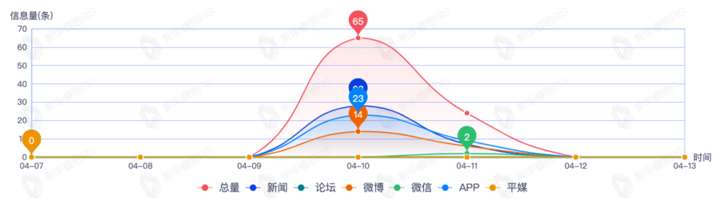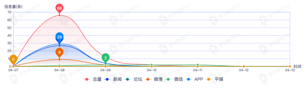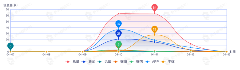 截至目前,该文章在互联网上传播总量140篇。其中4月11日是传播的高峰期,共传播64篇文章。各信源的信息发布情况中,app信息占比最大,其次是新闻和平媒,信息量分别为63、40、30,占比分别为45.00%、28.57%、21.43%。(数据来源:新华睿思数据云图分析平台)