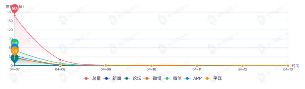 截至目前,该文章在互联网上传播总量191篇。其中4月7日是传播的高峰期,共传播168篇文章。各信源的信息发布情况中,微信信息占比最大,其次是app和新闻,信息量分别为60、38、31,占比分别为31.41%、19.90%、16.23%。(数据来源:新华睿思数据云图分析平台)