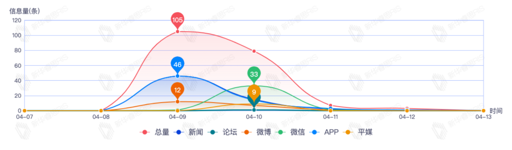 截至目前,该文章在互联网上传播总量97篇。其中4月9日是传播的高峰期,共传播46篇文章。各信源的信息发布情况中,app信息占比最大,其次是新闻和微博,信息量分别为36、35、15,占比分别为37.11%、36.08%、15.46%。(数据来源:新华睿思数据云图分析平台)