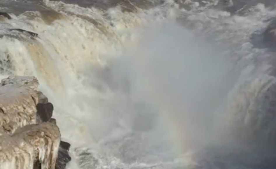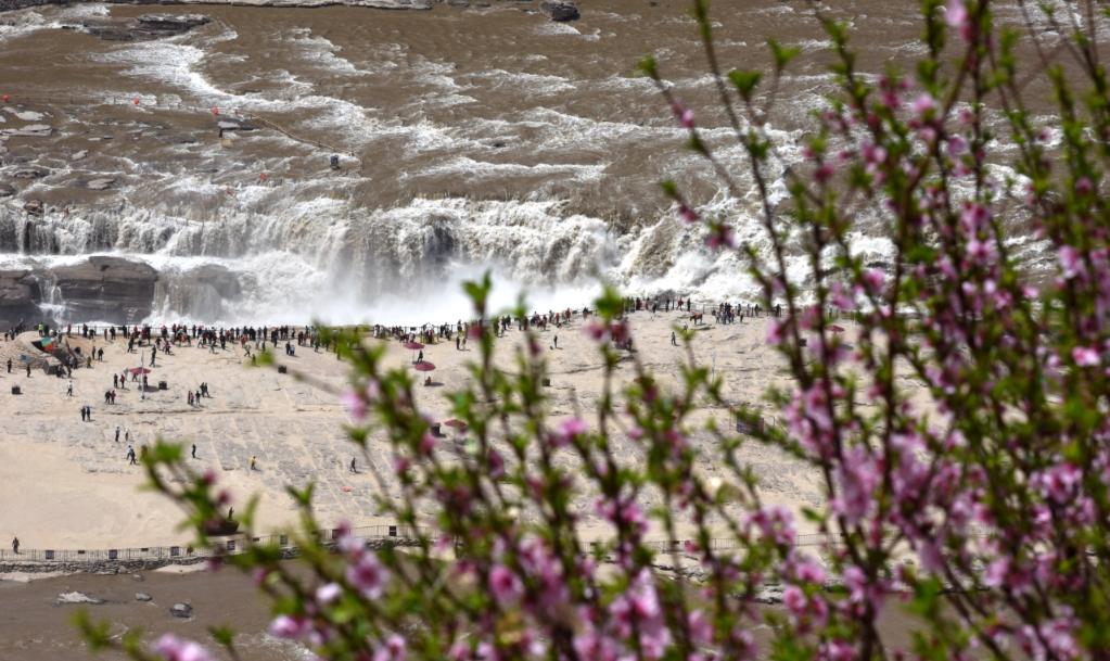 近日,位于山西吉县和陕西宜川县交界的黄河壶口瀑布迎来一年一度的“桃花汛”,水量激增的瀑布与沿岸盛开的山桃花相映成趣,宛如一幅壮美的春日画卷,吸引了众多游客前来观赏。(新华社记者王飞航)