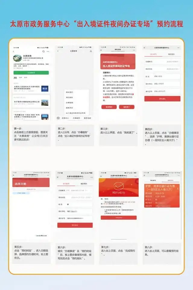 有出入境办证需求、无法在工作日时间前往办理的市民,可以提前预约夜间办证服务,微信搜索“太原政务”微信公众号,关注后在下方点击“办事服务”选择“出入境夜间办证专场”模块,在线预约成功后前往大厅排号办理。