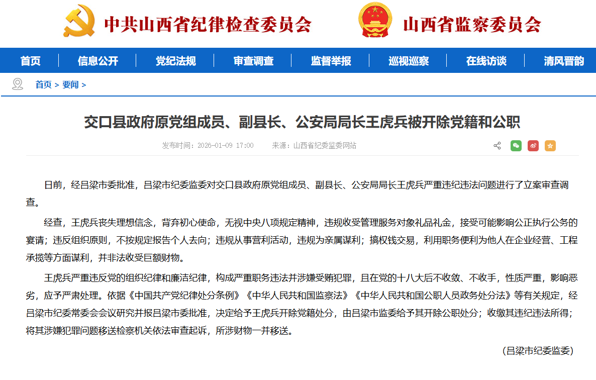 原标题:交口县政府原党组成员、副县长、公安局局长王虎兵被开除党籍和公职