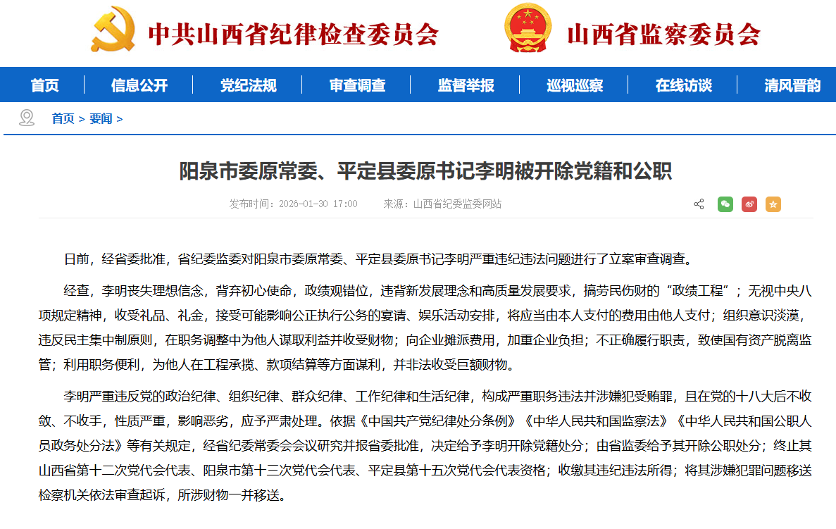 日前,经省委批准,省纪委监委对阳泉市委原常委、平定县委原书记李明严重违纪违法问题进行了立案审查调查。