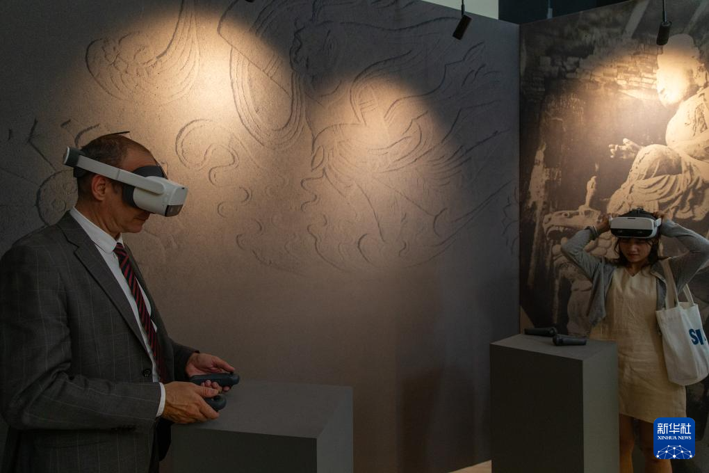 5月11日,参观者在希腊雅典扎皮翁宫使用vr眼镜欣赏中国石窟艺术。