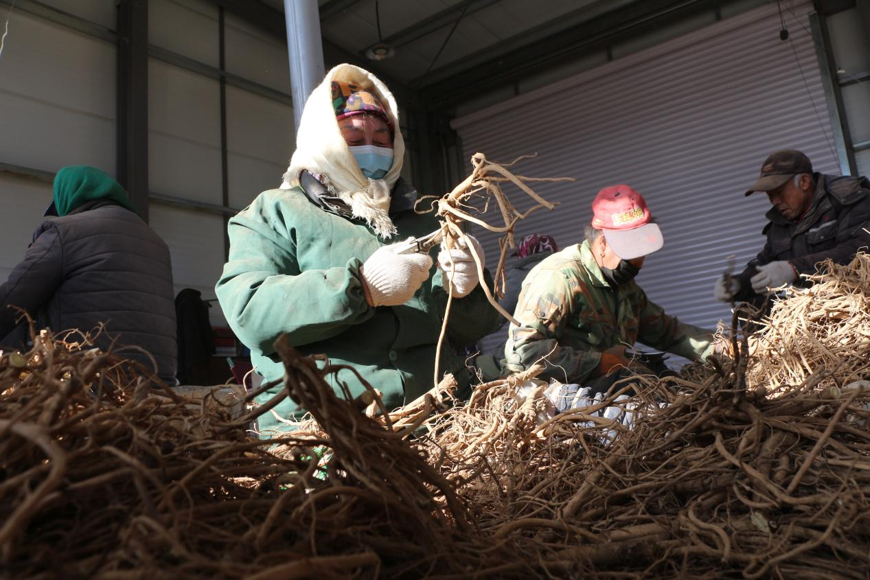 在五寨县中药健康产业孵化园的车间内,工人们正在清理黄芪表面的泥土。经过处理的黄芪整齐排列,等待开春天暖后进一步加工切片。
