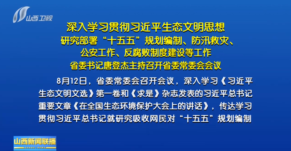 8月12日,省委常委会召开会议,深入学习《习近平生态文明文选》第一卷和《求是》杂志发表的习近平总书记重要文章《在全国生态环境保护大会上的讲话》,传达学习贯彻习近平总书记就研究吸收网民对“十五五”规划编制工作意见建议作出的重要指示精神,研究部署防汛救灾、公安工作、反腐败制度建设等工作。省委书记唐登杰主持会议。