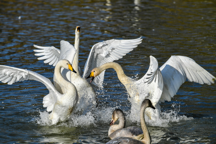 冬日的黄河湿地,藏不住勃勃生机,大天鹅扬起脖颈,啼声清越,同伴纷纷应和,一派其乐融融的景象。