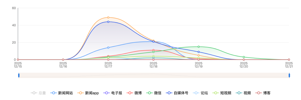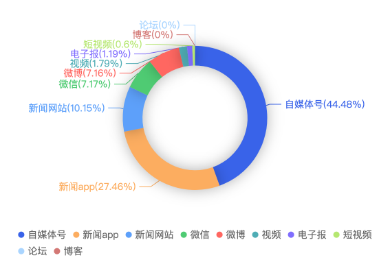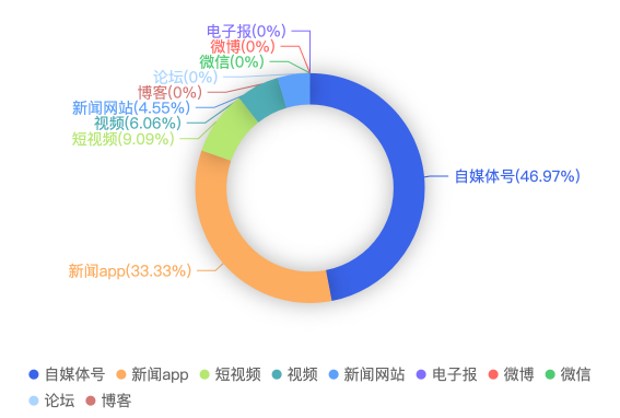 截至目前,该文章在互联网上传播总量共48篇。各信源的信息发布情况中,自媒体号占比最高,其次是新闻app。(数据来源:新华睿思数据云图分析平台)