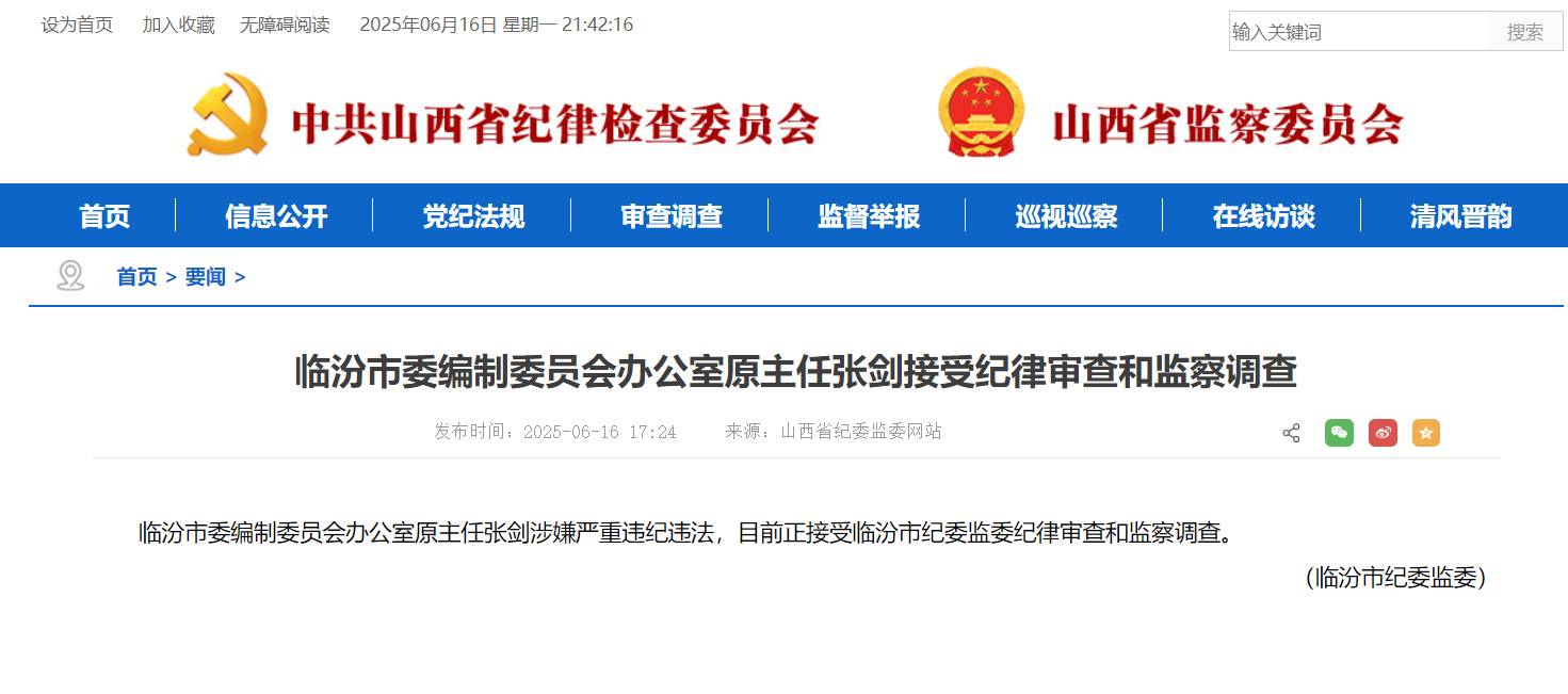 原标题:临汾市委编制委员会办公室原主任张剑接受纪律审查和监察调查
