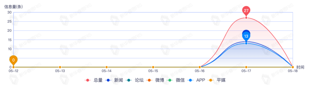 截至目前,该文章在互联网上传播总量共27篇。其中,5月17日是传播的高峰期,共传播27篇文章。各信源的信息发布情况中,新闻信息占比最大,其次是app,信息量分别为14、13,占比分别为51.85%、48.15%。(数据来源:新华睿思·数媒智慧分析平台)