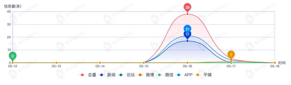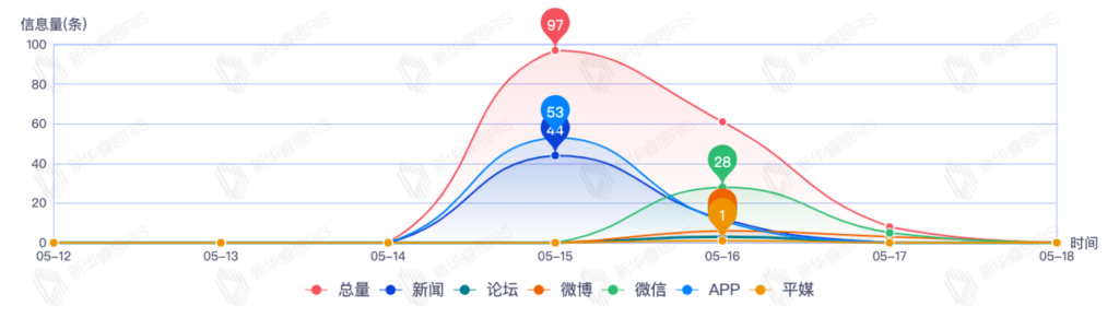 截至目前,该文章在互联网上传播总量共151篇。其中,5月15日是传播的高峰期,共传播85篇文章。各信源的信息发布情况中,新闻信息占比最大,其次是app和微博,信息量分别为64、54、13,占比分别为43.54%、36.73%、8.84%。(数据来源:新华睿思·数媒智慧分析平台)