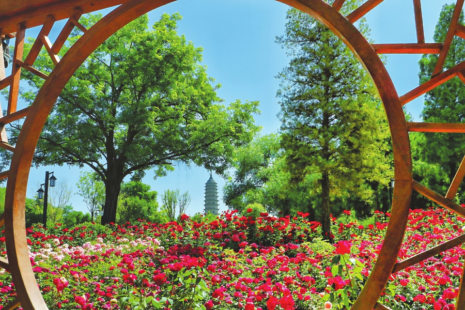日前,太原市双塔公园内绿树成荫、繁花似锦,芍药月季竞相绽放,与双塔遥相辉映。