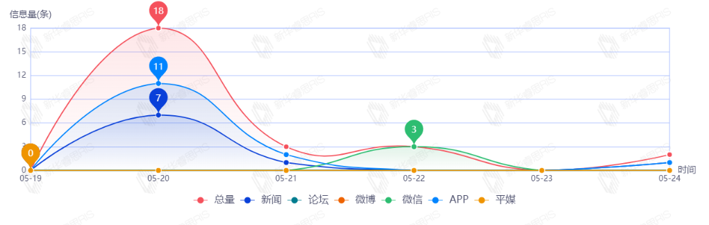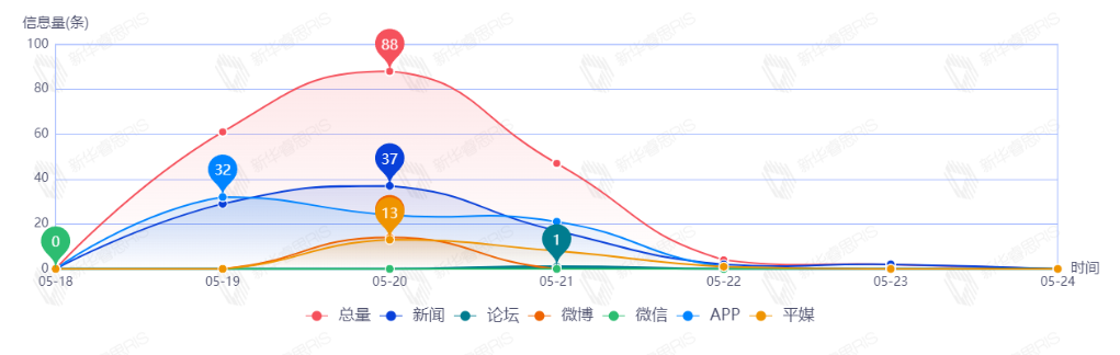截至目前,该文章在互联网上传播总量202篇。其中5月20日是传播的高峰期,共传播88篇文章。各信源的信息发布情况中,新闻信息占比最大,其次是app和平媒,占比分别为43.07%、38.61%、10.89%。(数据来源:新华睿思数据云图分析平台)