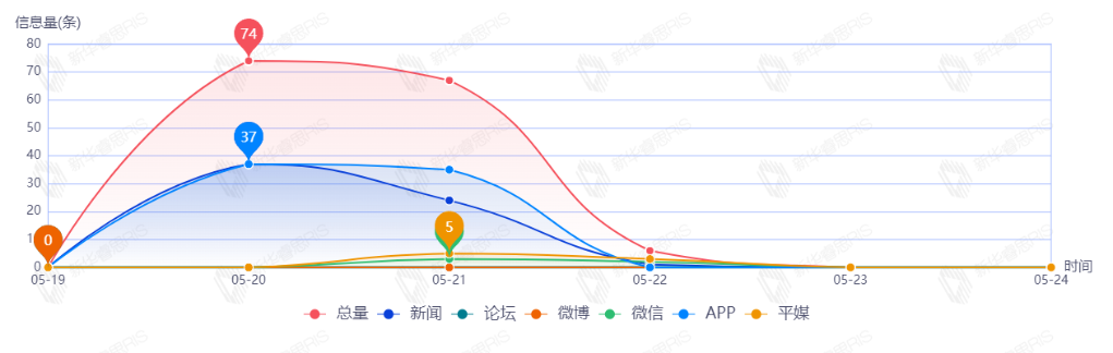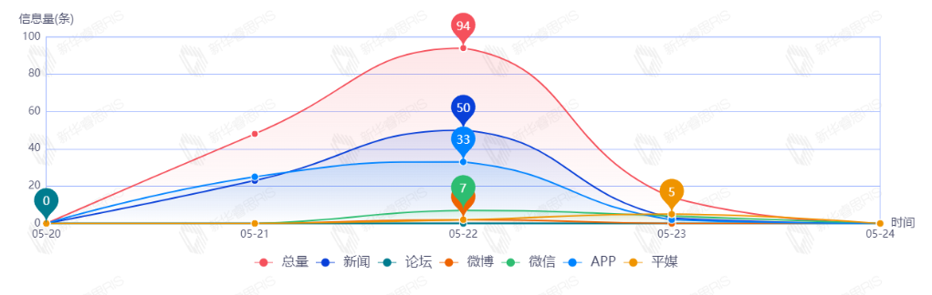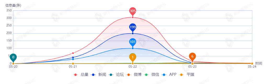截至目前,该文章在互联网上传播总量393篇。其中5月22日是传播的高峰期,共传播305篇文章。各信源的信息发布情况中,新闻信息占比最大,其次是app和微博,占比分别为62.34%、33.59%、2.54%。(数据来源:新华睿思数据云图分析平台)