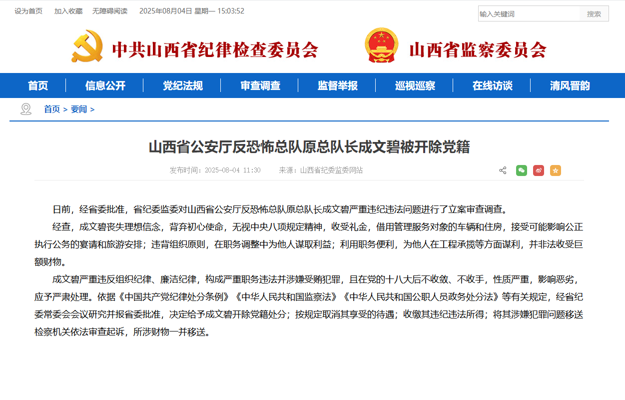日前,经省委批准,省纪委监委对山西省公安厅反恐怖总队原总队长成文碧严重违纪违法问题进行了立案审查调查。