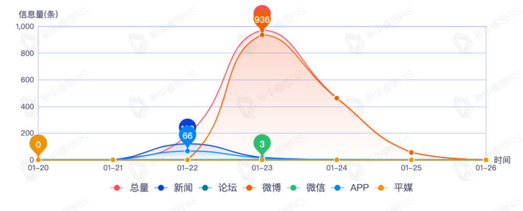 截至目前,该文章在互联网上传播总量共1678篇。其中,1月23日是传播的高峰期,共传播971篇文章。各信源的信息发布情况中,微博信息占比最大,其次是新闻和app,信息量分别为1345、139、79,占比分别为85.89%、8.88%、5.04%。(数据来源:新华睿思·数媒智慧分析平台)