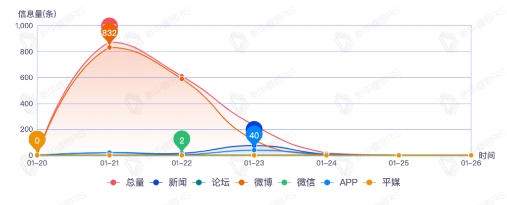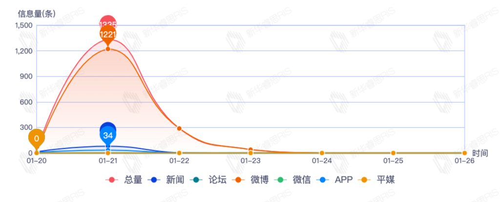 截至目前,该文章在互联网上传播总量共1689篇。其中,1月21日是传播的高峰期,共传播1335篇文章。各信源的信息发布情况中,微博信息占比最大,其次是新闻和app,信息量分别为1487、96、41,占比分别为91.56%、5.91%、2.52%。(数据来源:新华睿思·数媒智慧分析平台)