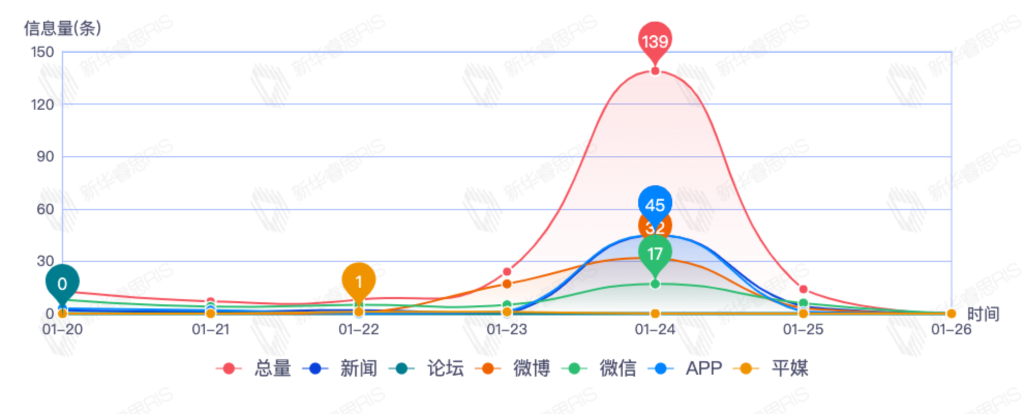 截至目前,该文章在互联网上传播总量共205篇。其中,1月24日是传播的高峰期,共传播139篇文章。各信源的信息发布情况中,新闻信息占比最大,其次是app和微博,信息量分别为54、51、47,占比分别为27.14%、25.63%、23.62%。(数据来源:新华睿思·数媒智慧分析平台)