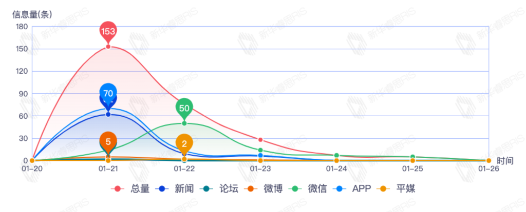 截至目前,该文章在互联网上传播总量共269篇。其中,1月21日是传播的高峰期,共传播153篇文章。各信源的信息发布情况中,微信信息占比最大,其次是app和新闻,信息量分别为90、90、77,占比分别为33.46%、33.46%、28.62%。(数据来源:新华睿思·数媒智慧分析平台)