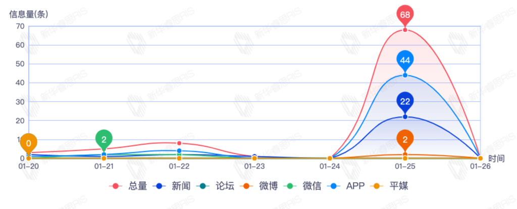 截至目前,该文章在互联网上传播总量共37篇。其中,1月23日是传播的高峰期,共传播25篇文章。各信源的信息发布情况中,新闻信息占比最大,其次是app和平媒,信息量分别为17、16、1,占比分别为47.22%、44.44%、2.78%。(数据来源:新华睿思·数媒智慧分析平台)