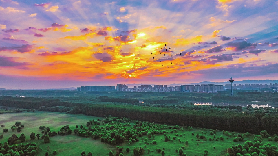 7月6日清晨,长治市漳泽湖国家城市湿地公园,万丈晨光洒向湿地,城市、民居、河流、树木相互呼应,形成一幅美丽的湿地晨景。