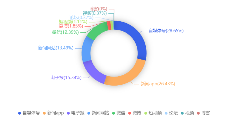 截至目前,该文章在互联网上传播总量共541篇。各信源的信息发布情况中,自媒体号占比最大,其次是新闻app,占比分别为28.65%、26.43%。(数据来源:新华睿思·数媒智慧分析平台)