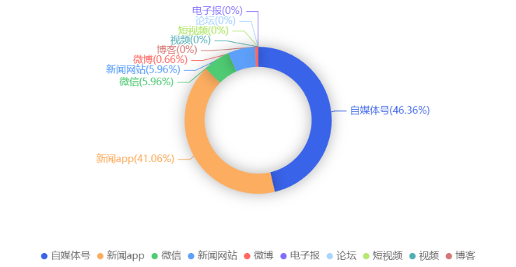 截至目前,该文章在互联网上传播总量共151篇。各信源的信息发布情况中,自媒体号占比最大,其次是新闻app,占比分别为46.36%、41.06%。(数据来源:新华睿思·数媒智慧分析平台)