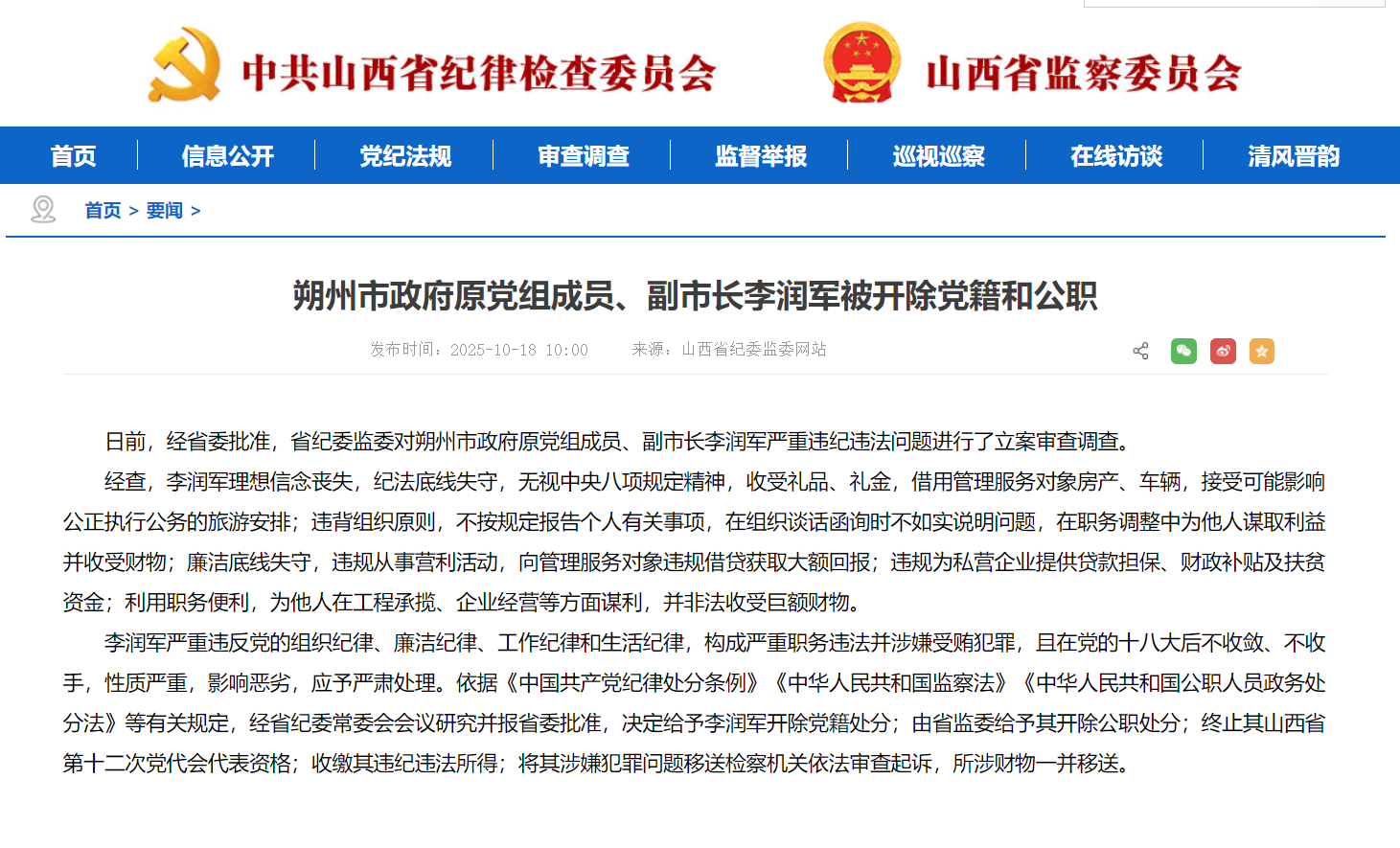 日前,经省委批准,省纪委监委对朔州市政府原党组成员、副市长李润军严重违纪违法问题进行了立案审查调查。