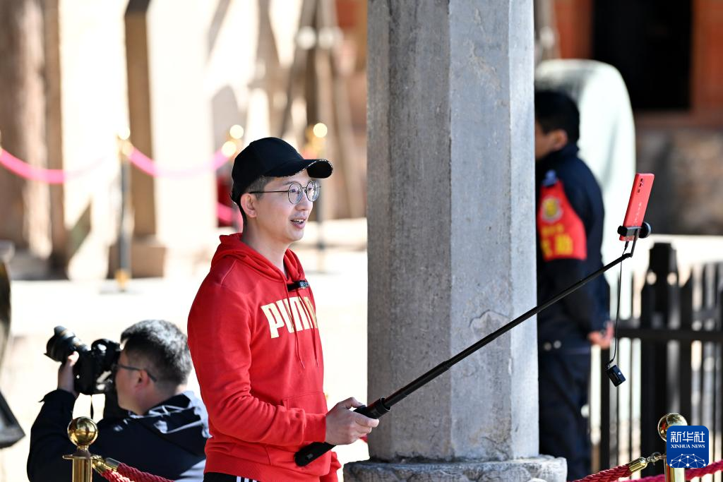游客在手机上直播介绍五台山佛光寺东大殿(2024年10月11日摄)。新华社记者 詹彦 摄