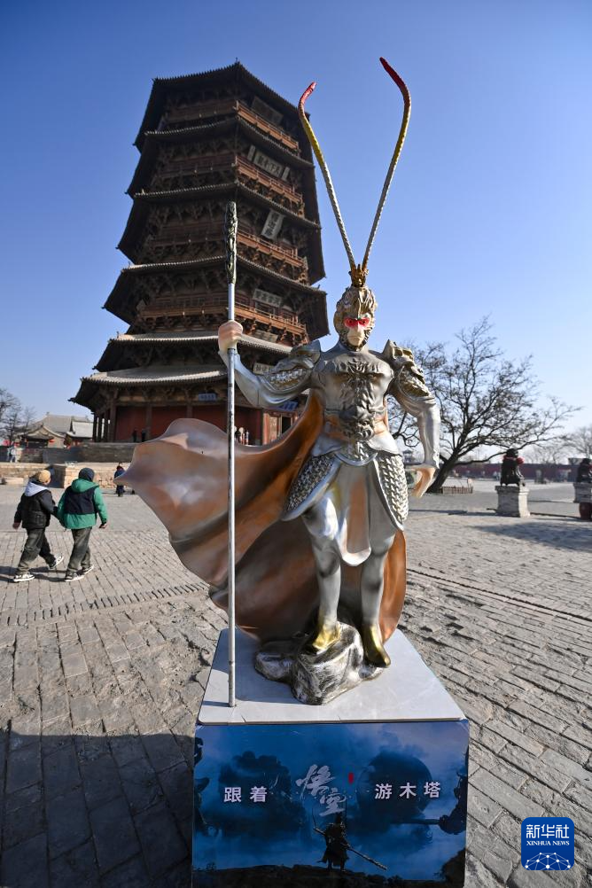 这是在应县木塔景区内设立的“跟着悟空游山西”文旅推介产品(2025年2月27日摄)。新华社记者 杨晨光 摄