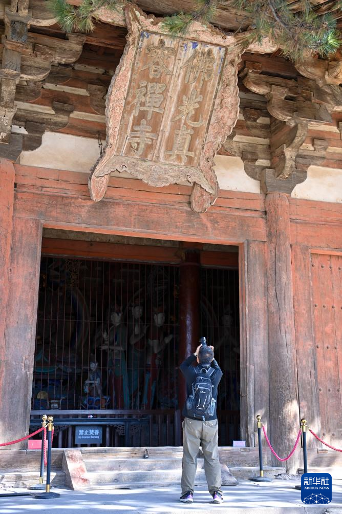 游客在五台山佛光寺东大殿拍照(2024年10月11日摄)。新华社记者 杨晨光 摄
