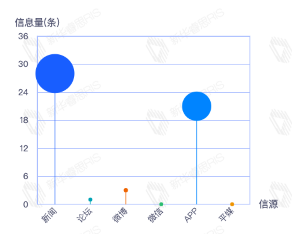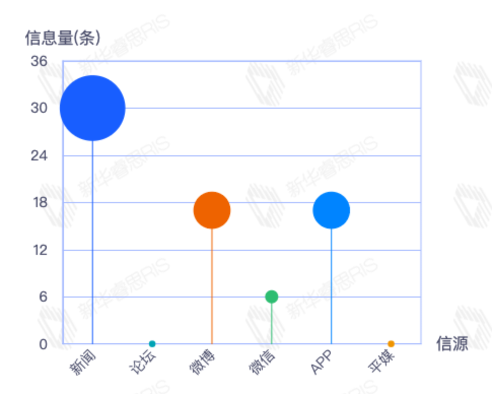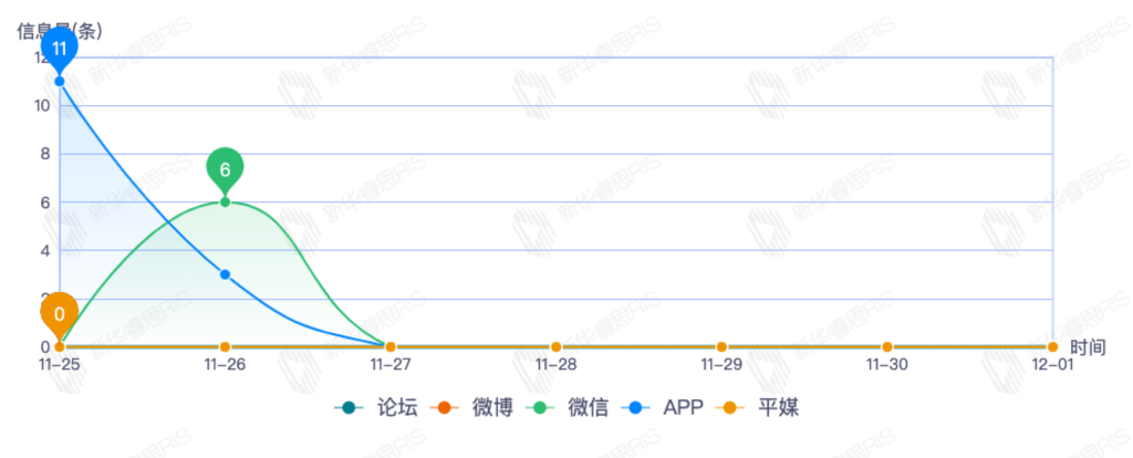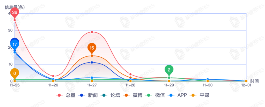 截至目前,该文章在互联网上传播总量35篇。其中11月25日是传播的高峰期,共传播11篇文章。各信源的信息发布情况中,新闻信息占比最大,其次是app和微信,信息量分别为15、11、6,占比分别为46.88%、34.38%、18.75%。(数据来源:新华睿思数据云图分析平台)