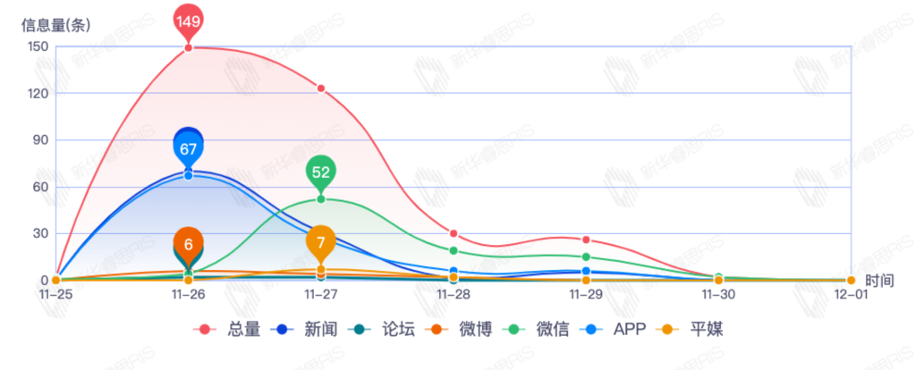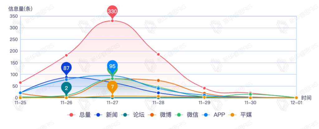 截至目前,该文章在互联网上传播总量331篇。其中11月26日是传播的高峰期,共传播149篇文章。各信源的信息发布情况中,新闻信息占比最大,其次是微信和app,信息量分别为105、93、72,占比分别为35.59%、31.53%、24.41%。(数据来源:新华睿思数据云图分析平台)