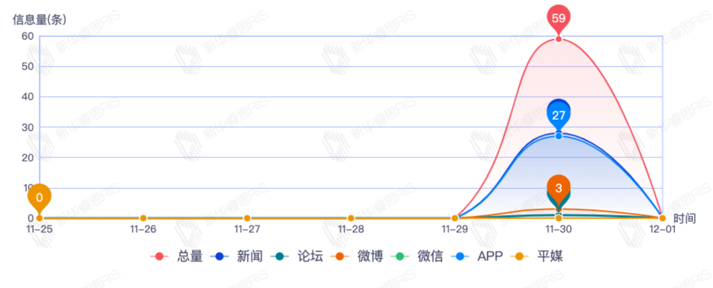 截至目前,该文章在互联网上传播总量59篇。其中11月30日是传播的高峰期,共传播59篇文章。各信源的信息发布情况中,新闻信息占比最大,其次是app和微博,信息量分别为28、21、3,占比分别为52.83%、39.62%、5.66%。(数据来源:新华睿思数据云图分析平台)