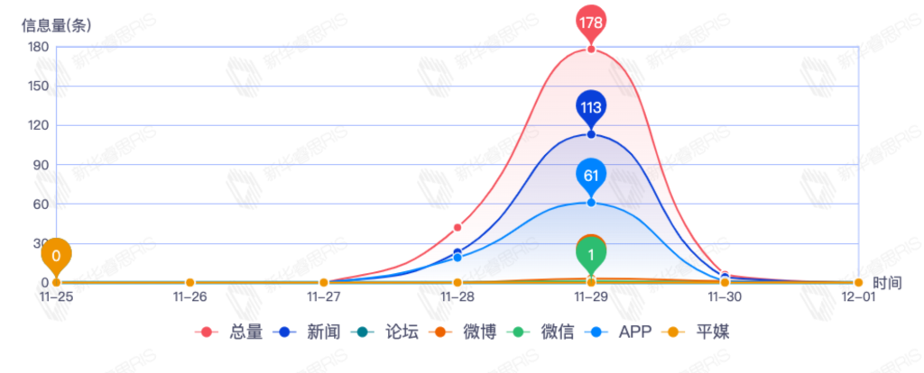 截至目前,该文章在互联网上传播总量226篇。其中11月29日是传播的高峰期,共传播178篇文章。各信源的信息发布情况中,新闻信息占比最大,其次是app和微博,信息量分别为140、54、4,占比分别为70.35%、27.14%、2.01%。(数据来源:新华睿思数据云图分析平台)