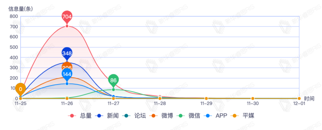 截至目前,该文章在互联网上传播总量917篇。其中11月26日是传播的高峰期,共传播704篇文章。各信源的信息发布情况中,新闻信息占比最大,其次是微博和app,信息量分别为392、237、113,占比分别为46.28%、27.98%、13.34%。(数据来源:新华睿思数据云图分析平台)